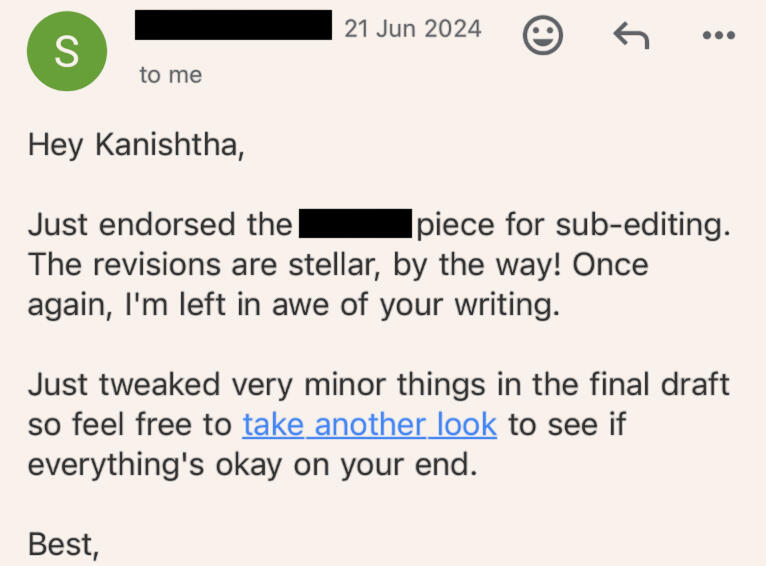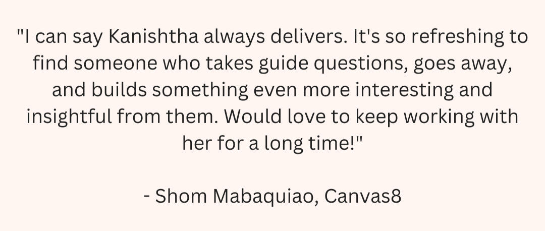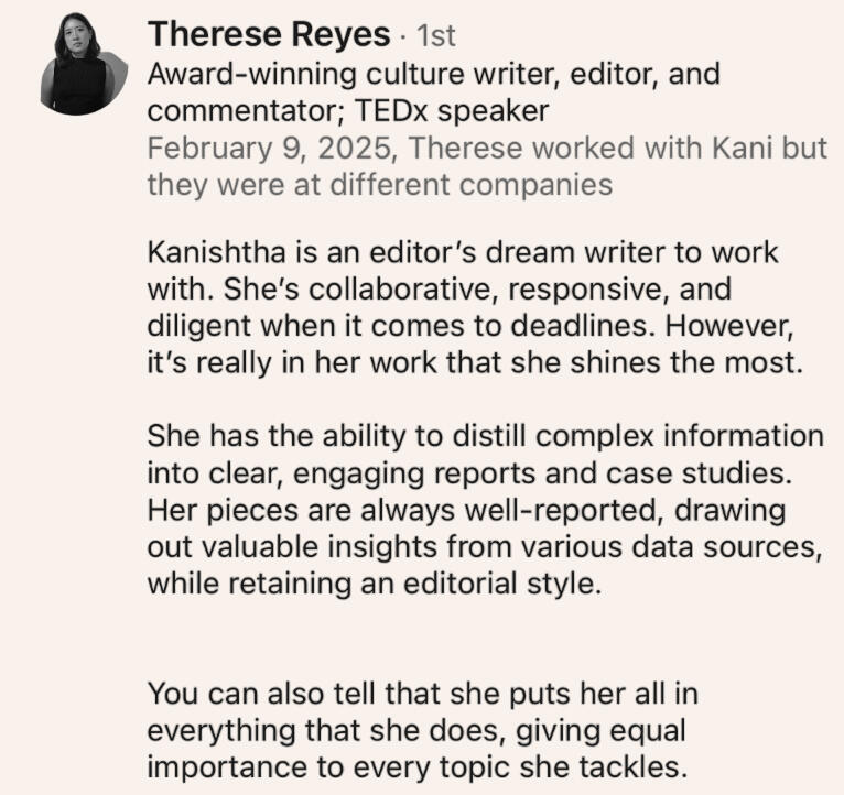 If brevity is the soul of wit, consider me Shakespeare with a Google Doc.I don’t just write for you. I create narratives, clarity, impact, sometimes even goosebumps. (And yes, I obsess over the punctuation too.)I was the corporate lawyer who secretly rewrote everyone’s emails.Strategy decks, board notes, investor memos — somehow I always became the “words person” in the room.Now, I ghostwrite for founders and execs who don’t have the time to write, or the patience to sound like everyone else online — robotic, repetitive, or like they asked ChatGPT and prayed.It’s the perfect mix of everything I’m built for — real connection, storycraft, and helping people feel less alone. (Okay, and asking extremely nosy questions you’ll in hindsight thank me for.)Expect content that sounds just like you — on your smartest, most clear-eyed day.You bring the brief, I bring the bite.And together, we make the internet care.